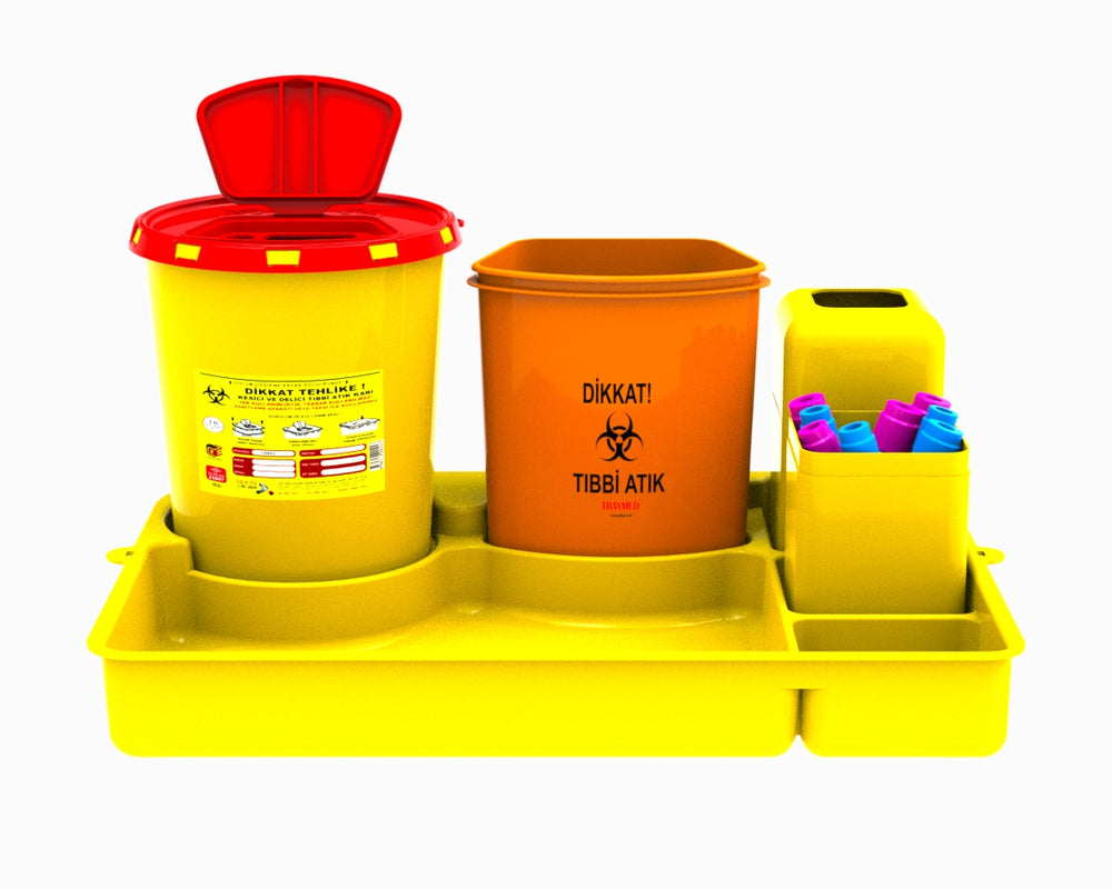 6 bölmeli tedavi tepsisidir. Bir bölmesi ihtiyaca göre, 1,2-1,5 ve 2,0 LT Tıbbi atık kutusu için tasarlanmıştır. Bir bölmesi 1,2-1,3-2,0 LT kirli tıbbi atıklar için tasarlanmıştır. Tepsi ters çevrildiğinde dahi kutular düşmez.